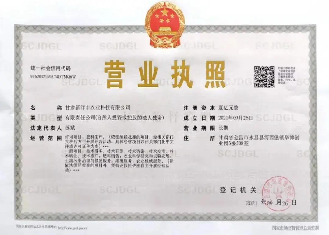 9月26日,新洋丰西北新基地项目建设取得重大进展,为实施该项目成立的全资子公司甘肃新洋丰农业科技有限公司(简称“甘肃新洋丰”)完成注册登记手续,并取得了由永昌县市场监督管理局核发的营业执照。甘肃新洋丰注册资本1亿元人民币。