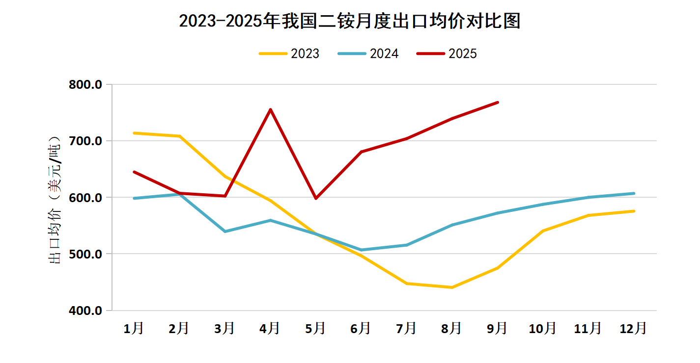 据中国海关统计,2025年1-9月我国磷酸二铵累计出口251.4万吨,较去年同期减少77.6万吨,降幅23.6%;平均出口价格713.2美元/吨,较去年同期上涨170.0美元/吨,涨幅31.3%。