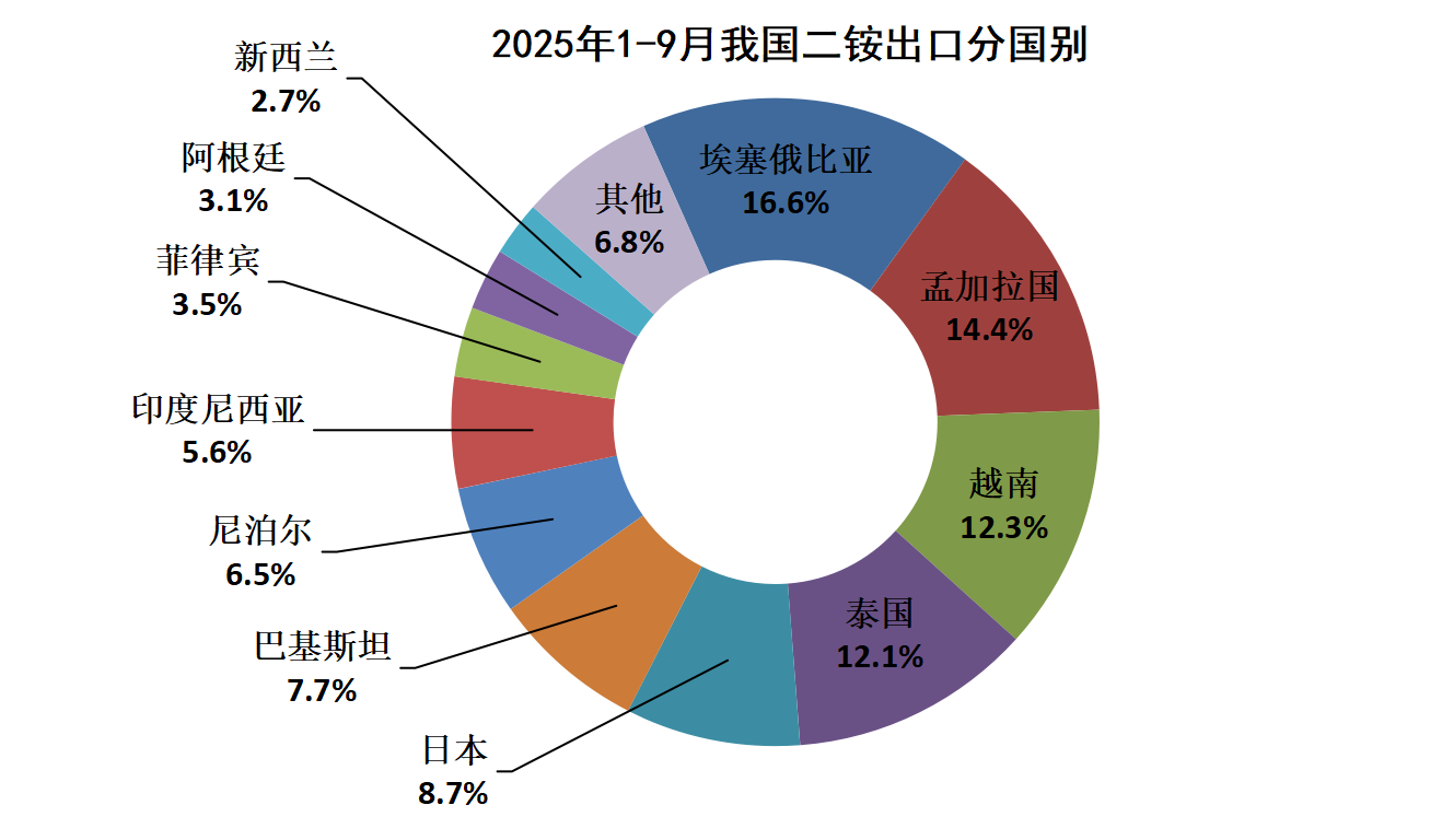 2025年1-9月,我国二铵主要出口埃塞俄比亚(41.8万吨)、孟加拉国(36.3万吨)、越南(36.9.1万吨)、泰国(30.4万吨)、日本(21.9万吨),向这五个国家的出口量占到总出口量的64.2%。