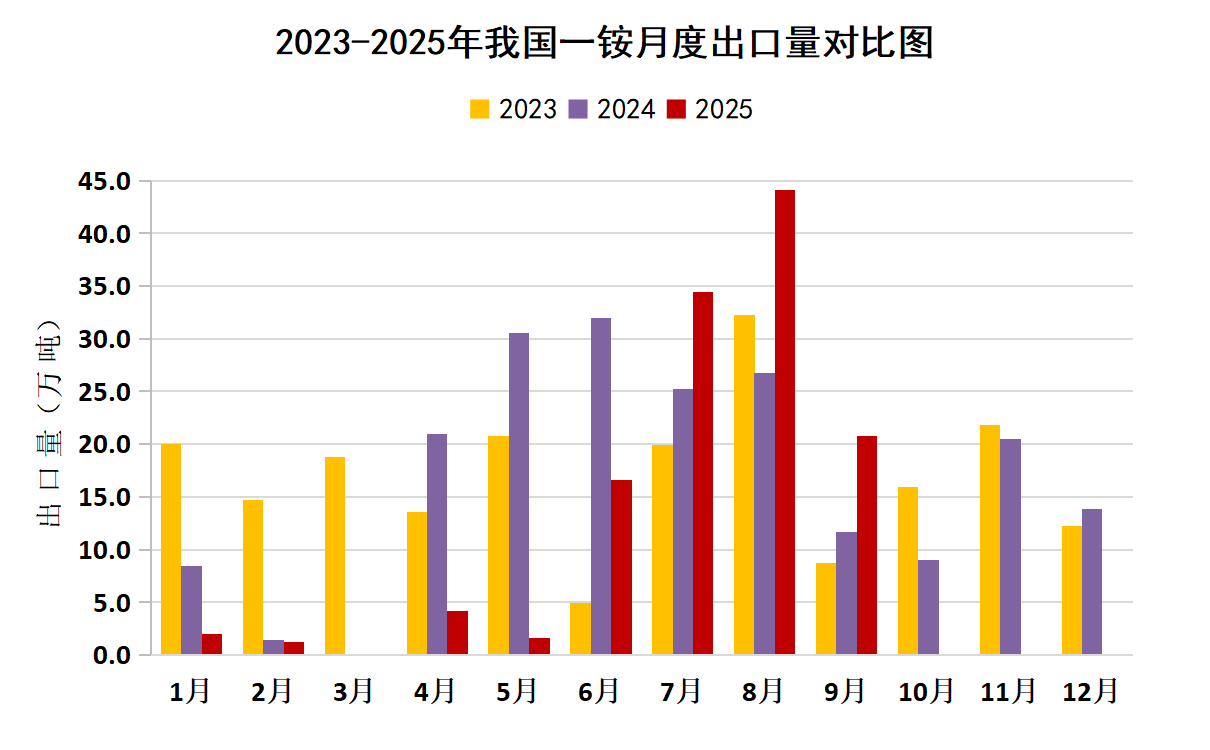 9月份一铵出口20.8万吨,同比增长78.3%,环比下降52.9%;平均出口价格732.9美元/吨,同比增长10.4%,环比增长5.7%。