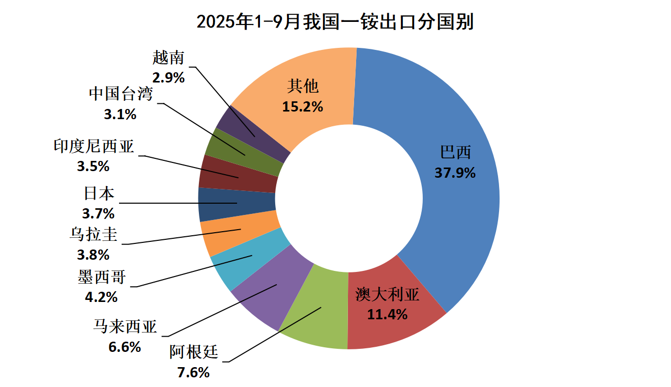 2025年1-9月,我国一铵主要出口巴西(47.4万吨)、澳大利亚(14.2万吨)、阿根廷(9.5万吨)、马来西亚(8.3万吨),向这四个国家的出口量占到总出口量的63.6%。