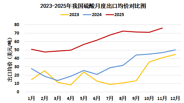 据中国海关统计,2025年1-11月我国出口硫酸412.4万吨,较去年同期增加196.1万吨,增幅90.7%;平均出口价格61.7美元/吨,较去年同期上涨31.1美元/吨,涨幅101.9%。