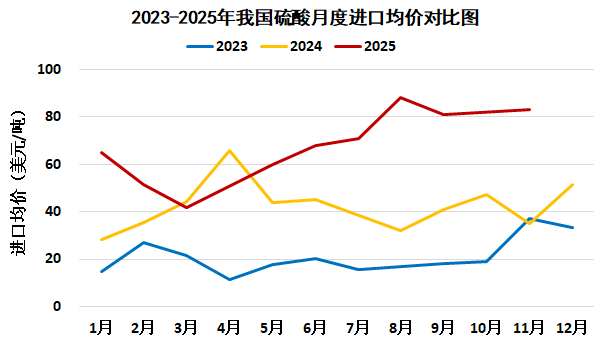 据中国海关统计,2025年1-11月我国进口硫酸11.8万吨,较去年同期减少3.6万吨,降幅23.2%。剔除高价酸后,平均进口价格69.6美元/吨,较去年同期增长29.9美元/吨,涨幅75.3%。