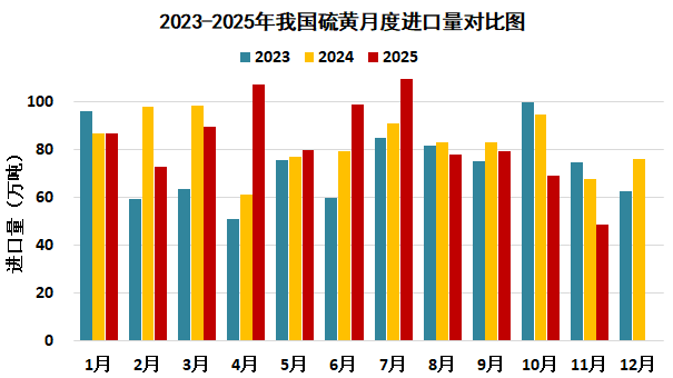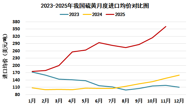 据中国海关统计,2025年1-11月中国进口硫黄918.6万吨,较去年同期减少0.6万吨,降幅0.1%;平均进口价格259.0美元/吨,较去年同期上涨146.4美元/吨,涨幅130.1%。