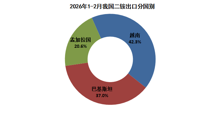 2026年1-2月,我国二铵主要出口越南(0.8万吨)、巴基斯坦(0.7万吨)、孟加拉国(0.4万吨)。