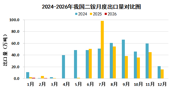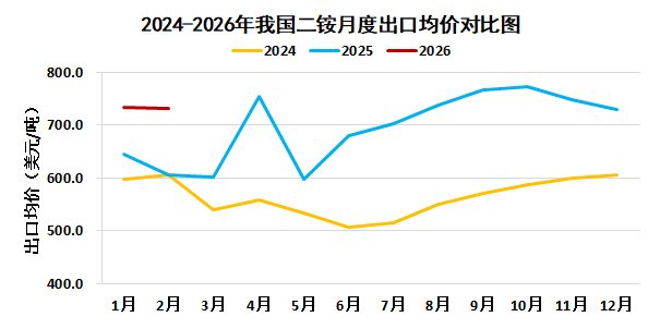 据中国海关统计,2026年1-2月我国磷酸二铵累计出口1.9万吨,较去年同期减少4.7万吨,降幅71.3%;平均出口价格733.8美元/吨,较去年同期上涨113.6美元/吨,涨幅18.3%。