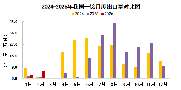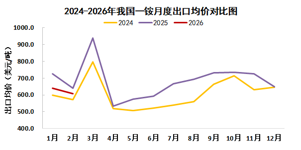 据中国海关统计,2026年1-2月我国磷酸一铵累计出口8.7万吨,较去年同期增加5.4万吨,涨幅168.0%;平均出口价格616.1美元/吨,较去年同期下降78.4美元/吨,降幅11.3%。
