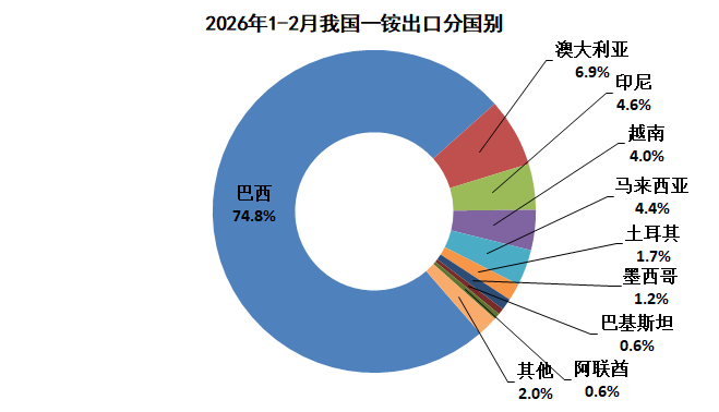 2026年1-2月,我国一铵主要出口巴西(6.5万吨)、澳大利亚(0.6万吨)、印尼(0.4万吨)、越南(0.4万吨),向这四个国家的出口量占到总出口量的90.3%。