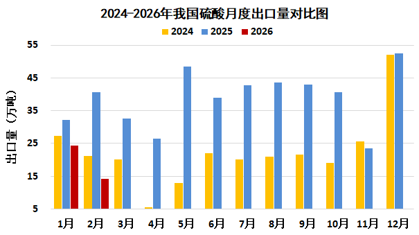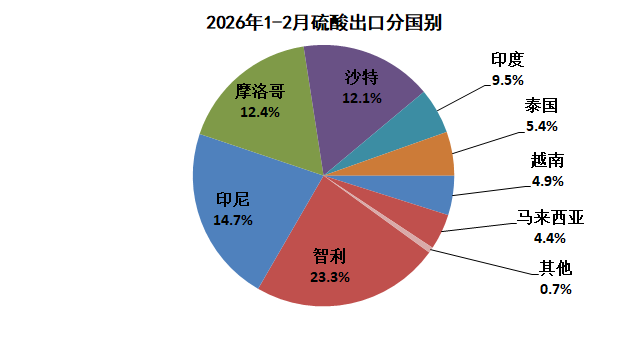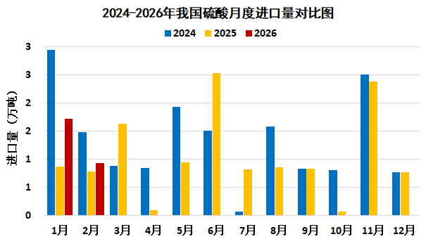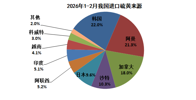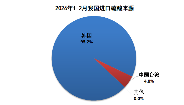 20261-2月,主要是从韩国(2.53万吨)、中国台湾(0.13万吨)进口硫酸