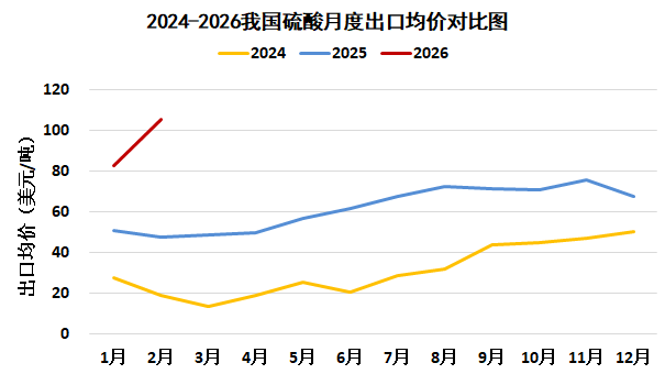 据中国海关统计,20261-2我国出口硫酸38.5万吨,较去年同期减少34.3万吨,47.1%;平均出口价格91.2美元/吨,较去年同期上涨42.0美元/吨,85.2%
