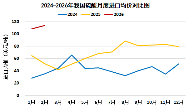 据中国海关统计,20261-2我国进口硫酸2.7万吨,较去年同期增加1.0万吨,60.9%。剔除高价酸后,平均进口价格110.0美元/吨,较去年同期增长52.0美元/吨,89.8%