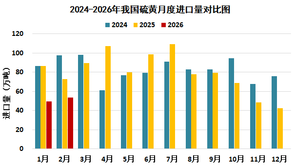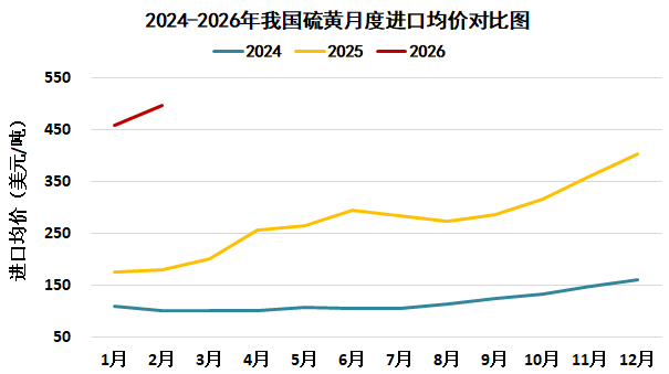 据中国海关统计,20261-2月中国进口硫黄103.5万吨,较去年同期减少55.8万吨,降幅35.0%;平均口价格478.7美元/吨,较去年同期上涨301.5美元/吨,170.2%